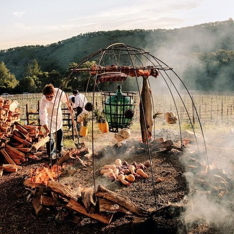 Waar ik ( Onno ) altijd geleerd heb in de klassieke Franse keuken in Parijs van 1 tot 3 sterren daar moesten wij altijd de zwezerik pocheren en dan portioneren ( in porties snijden ) dan bloemen en bakken in geklarifeerde roomboter. In Argentinie schrikken ze daarvan, hoezo bouillon trekken? Jullie Hollanders koken van alles in water ( trekken bouillon ) en dan gooien jullie het water met smaak nog weg ook! Daar ging voor mij een nieuwe wereld open. Zwezerik is nu spoelen, pellen, snijden en bakken op een hete placha. Zelfde geldt voor aardappelen poffen in plaats van koken, pastinaken roosteren en garen en niets meer koken. Als eer betoon hebben wij een Mallmann kooi gebouwd en bereiden wij klassieke Franse gerechten op openvuur en laten jullie ervaren hoe je smaken het beste kan bewaren in jouw gerecht.