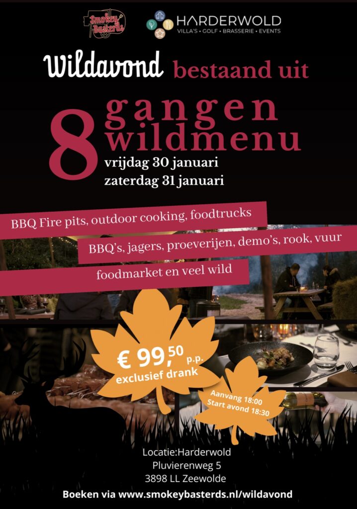 Onze wildavond is een echte beleving. Wij ontvangen u vanaf 18:00 en zullen om 18:30 starten met de heerlijke avond. Verwachte eindtijd ligt tussen 22:30 en 23:30 uur.