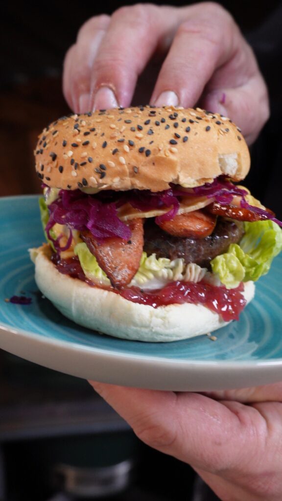 lekker in het seizoen hebben wij onze Hollandse hamburger met Old Amsterdam, rookworst en picalillymayonaise gemaakt met Kesbeke picalilly, dat in combinatie met zoet zuur van rode kool!